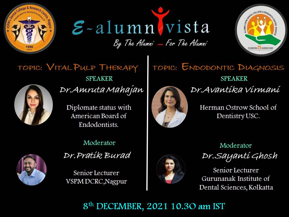 E alumni vista Topic:- Vital Pulp Therapy Topic :- Endodontic Diagnosis Date:- 08th December 2021, 10.30 am Event will be live on: https://facebook.com/VSPMOfficialPage/ [formidable id=53]