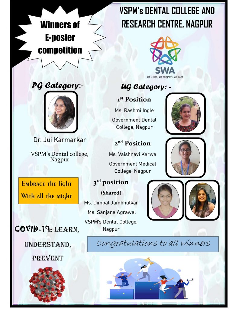 With a unique initiative to ensure the lockdown productivity, Student Council organized intercollegiate e-poster competition on COVID-19 to spread awareness on the Pandemic. We received great response from different colleges with total 53 participants. The competition was judged by Dr. Rajshree Kolte. All the posters were informative and unique which made it difficult to judge. The e-poster competition was the first of its kind online competition and was appreciated by all.