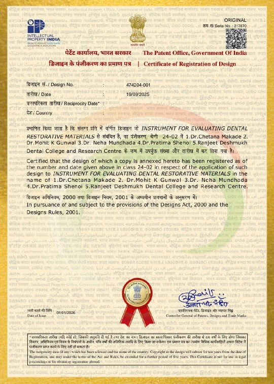 A Patent Granted by “Patent Office, Government of India” for the invention titled: “Instrument for evaluating dental restorative materials” with Patent No.474204-001, Application no. 217870, Date of Grant: 01/01/2026