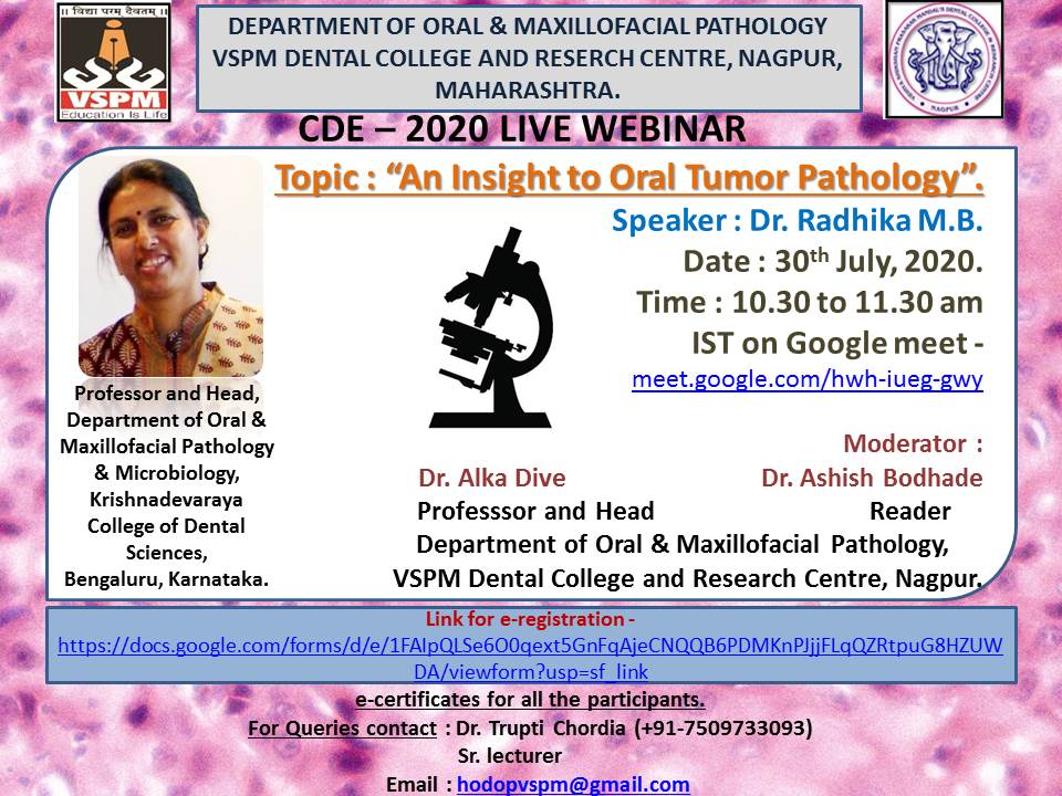 Department Of Oral And Maxillofacial Pathology organized a webinar on 30 th July 2020 at 10.30 am under the guidance of Dr. Alka Dive, Professor, and Head of the Department.