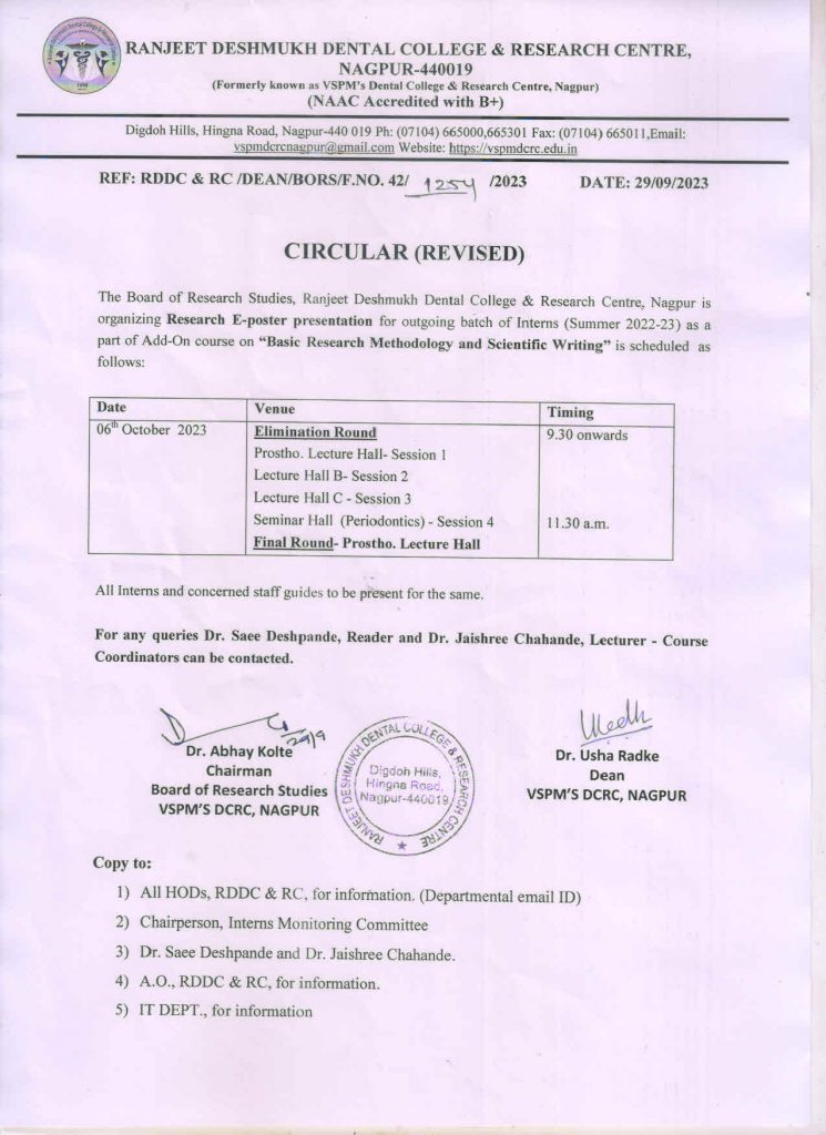 Board of Research Studies, Ranjeet Deshmukh Dental College & Research Centre, Nagpur organizing Research Project e-Poster Presentation competition for completion of Add-on Course: “Basic Research Methodology and Scientific Writing” for 2022-23 Summer Batch Interns from 9:30 a.m. onwards on 6th October 2023.