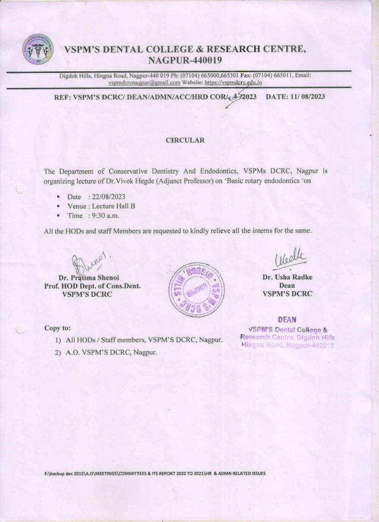 Department of Conservative Dentistry and Endodontics, Ranjeet Deshmukh Dental College and Research Centre, Nagpur organizing Lecture on “Basic Rotary Endodontics” by Dr. Vivek Hegde (Adjunct Professor) in Lecture Hall B at 09:30 a.m. on 22nd August 2023.