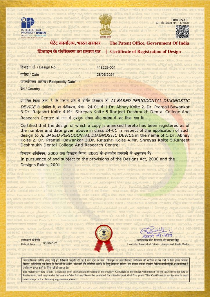 A Design Patent has been granted to Dr. Abhay Kolte, Dean, H.O.D., Professor, P.G. & Ph.D. Guide, Dr. Pranjali Bawankar, Sr. Lecturer, Dr. Rajashree Kolte, Professor, P.G. & Ph.D. Guide, Department of Periodontics and Implant Dentistry, Ranjeet Deshmukh Dental College And Research Centre, Nagpur for an invention entitled: “AI BASED PERIODONTAL DIAGNOSTIC DEVICE”, from The Patent Office, Government of India on 28th May 2024.