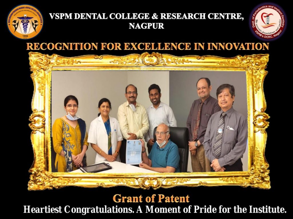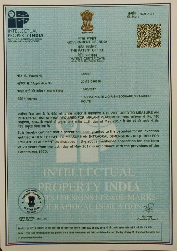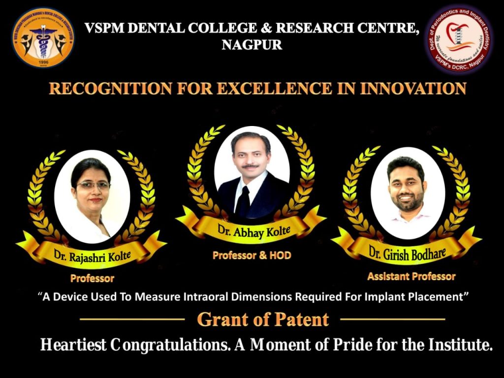 A Patent has been granted to Dr. Abhay Kolte, H.O.D., Professor, P.G. & Ph.D. Guide, Dr. Rajashree Kolte, Professor, P.G. & Ph.D. Guide and Dr. Girish Bodhare, Assistant Professor, Department of Periodontics and Implant Dentistry, VSPM Dental College & Research Centre, Nagpur for an invention entitled: “A DEVICE USED TO MEASURE AN INTRAORAL DIMENSIONS REQUIRED FOR IMPLANT PLACEMENT”, for the term of 20 years from 11th May 2017 from The Patent Office, Government of India.