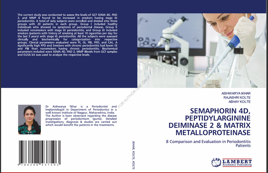 Dr. Aishwarya Ikhar, Senior Lecturer, Dr. Rajashri Kolte, Professor and PG Guide, Department of Periodontics and Implant Dentistry and Dr. Abhay Kolte, Dean and Head of the Department, Department of Periodontics and Implant Dentistry, authored E-Book titled: “Semaphorin 4 D, Peptidylarginine Deiminase 2 and Matrix Metalloproteinase 8 comparison and Evaluation in Periodontitis Patients”- 15th September, 2025.