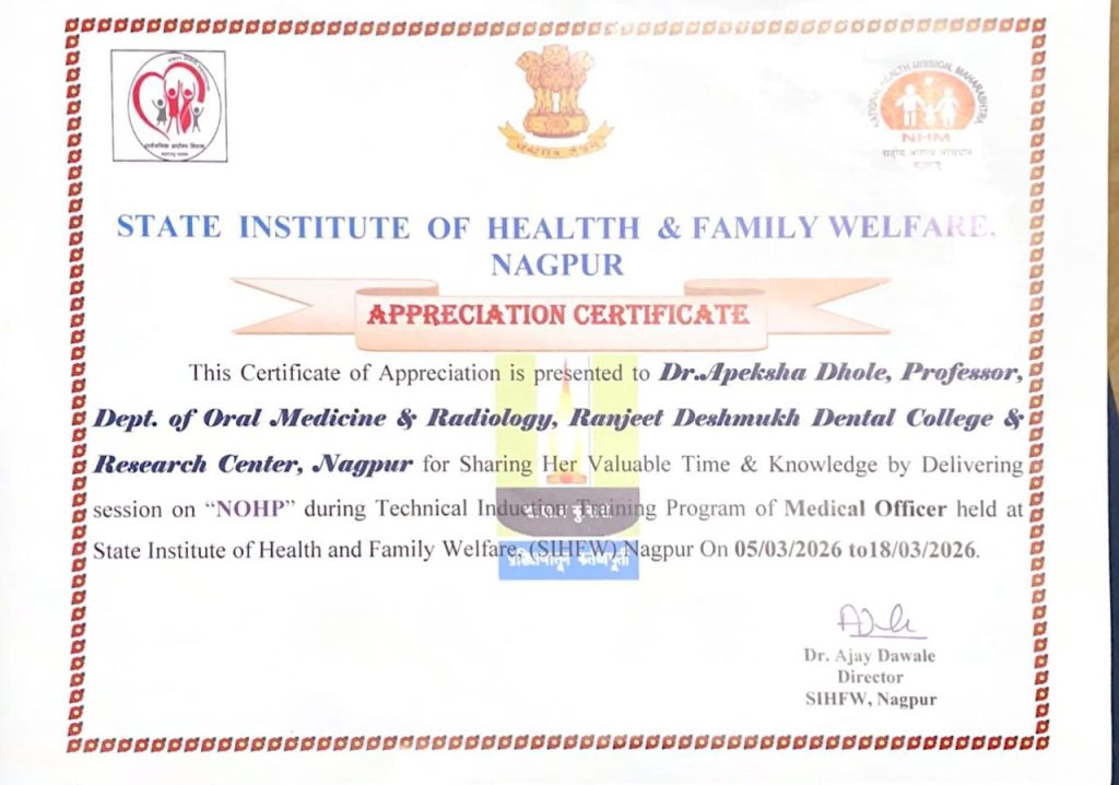 Dr. Apeksha Dhole, Professor, department of Oral Medicine & Radiology, Ranjeet Deshmukh Dental College and Research Centre, Nagpur as Guest Speaker on topic “NOHP” during technical induction training program of Medical Officer at State Institute of Health & Family Welfare, Nagpur from 5th to 18th February 2026.