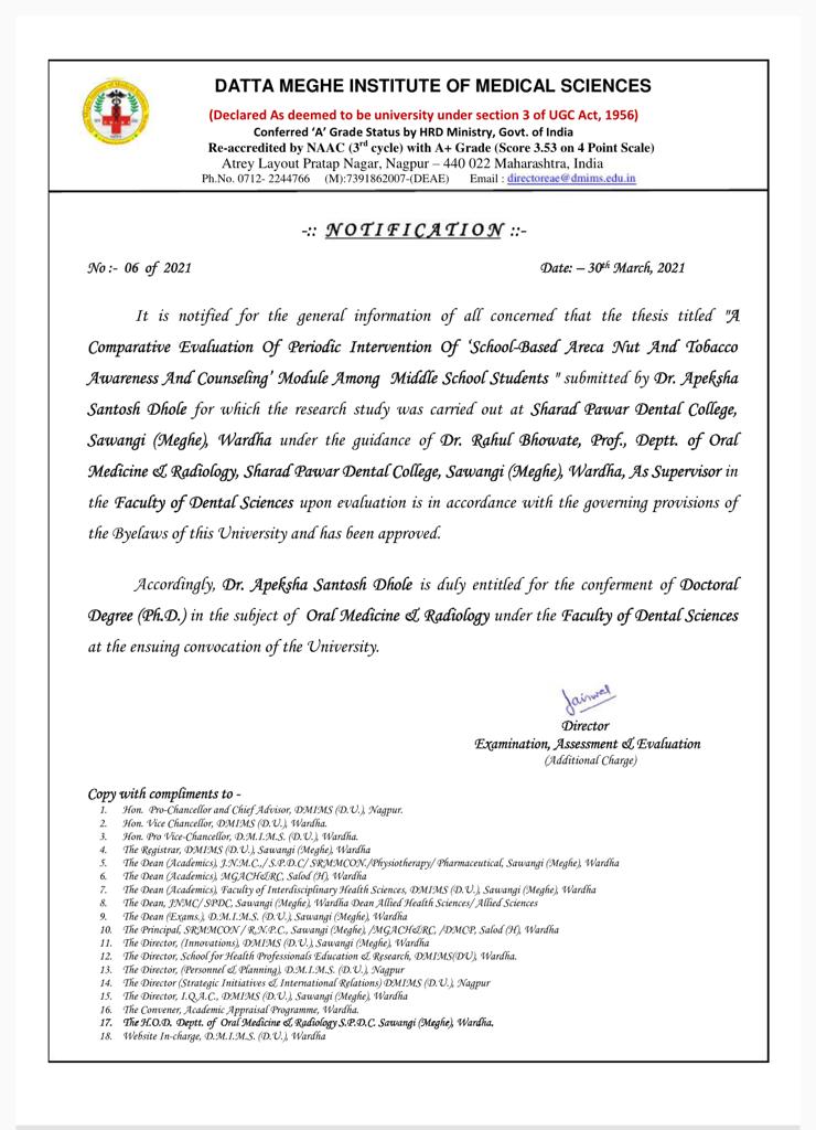 Dr. Apeksha Dhole, Professor & PG Guide, Department of Oral Medicine & Radiology, VSPM Dental College & Research Centre, Nagpur has been awarded Ph.D. in the subject of Oral Medicine & Radiology by Datta Meghe Institute of Medical Sciences (Deemed to be University) The topic of her research was,” A Comparative Evaluation of Periodic Intervention of ‘School-Based Areca Nut and Tobacco Awareness and Counselling’ Module among Middle School Students”, under the Guidance of Dr. Rahul Bhowate, Professor, Dept. of Oral Medicine & Radiology, Sharad Pawar Dental College, Sawangi (Meghe) Wardha