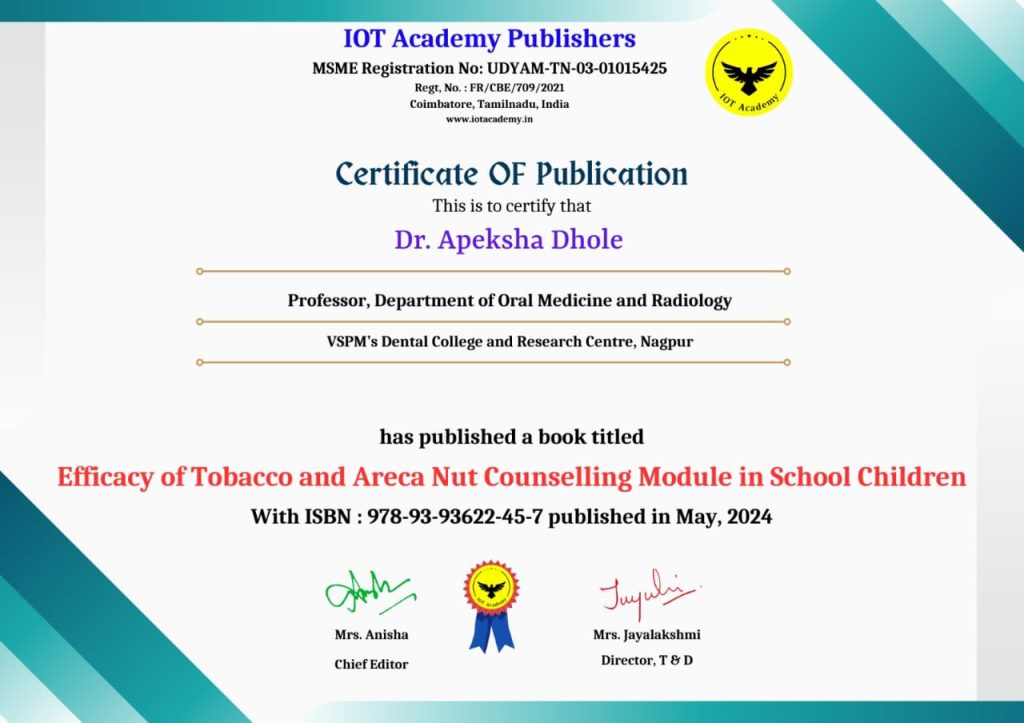 Dr. Apeksha Dhole, Professor & PG Guide, Department of Oral Medicine & Radiology, Ranjeet Deshmukh Dental College & Research Centre, Nagpur has published a Book titled: “Efficacy of Tobacco and Areca Nut Counselling Module in School Children” with ISBN:978-93-93622-45-7 Published by IOT Academy Publishers in May 2024.