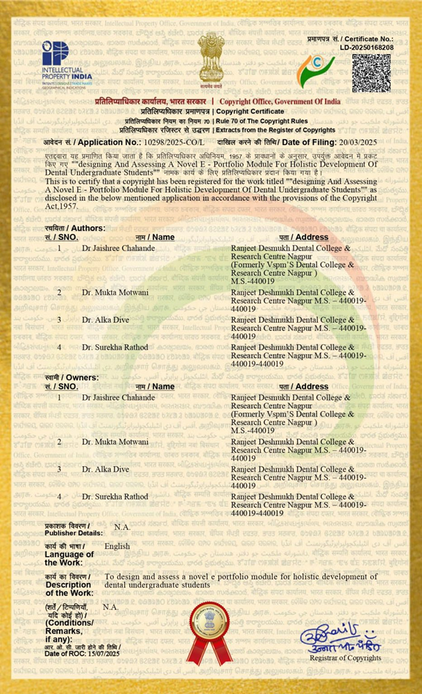 Dr. Jaishree Chahande, Lecturer, Department of Prosthodontics, Dr. Mukta Motwani, Vice Dean Clinical, HOD, Professor PhD & P.G. Guide, Department of Oral Medicine and Radiology, Dr. Alka Dive, HOD, PhD and PG Guide, Department of Oral & Maxillofacial Pathology and Dr. Surekha Rathod, Professor, Ph. D. & P.G. Guide, Department of Periodontics and Implant Dentistry, Ranjeet Deshmukh Dental College & Research Centre, Nagpur received a Copyright from Copyright Office, Government of India for Literary work titled: “Designing and Assessing A Novel E – Portfolio Module for Holistic Development of Dental Undergraduate Students” (Certificate No. LD-20250168208) on 15th July 2025.