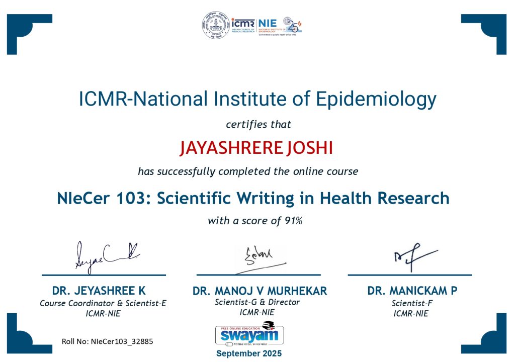 Dr. Jayashree Joshi, Lecturer, Dept. of Prosthodontics, Ranjeet Deshmukh Dental College and Research Centre, Nagpur successfully completed the ICMR-NIE online course on ‘Scientific Writing in Health Research’ from SWAYAM – a Government of India portal supported by the Ministry of Education in September 2025.