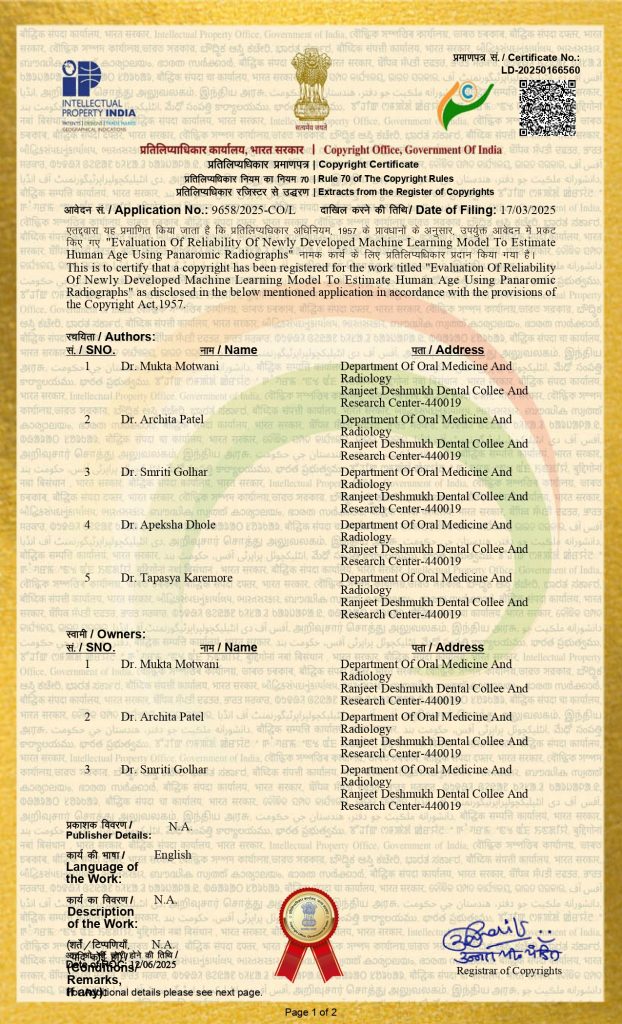 Dr. Mukta Motwani, Professor & HOD, Dr. Archita Patel, MDS 1st year, Dr. Smriti Golhar, Reader, Dr. Apeksha Dhole, Professor, Dr. Tapasya Karemore, Reader, Dr. Rucha Pandharipande, Senior Lecturer, Dr. Zareesh Akhtar, Senior Lecturer, Department of Oral Medicine & Radiology, Ranjeet Deshmukh Dental College & Research Centre, Nagpur received copyright 9658/2025-CO/L dated on 17/03/2025 of titled ‘Evaluation of reliability of newly developed machine learning model to estimate human age using panoramic radiographs.’