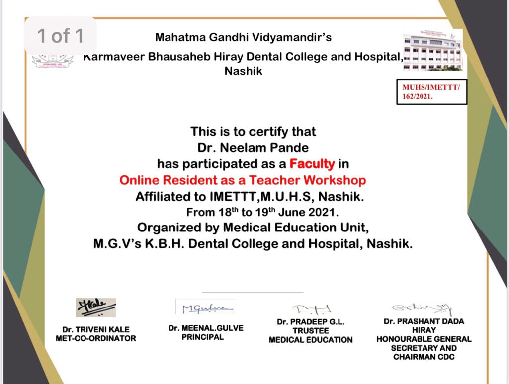 Dr. Neelam Pande, Professor, Ph.D. & P.G. Guide, Department of Prosthodontics, VSPM Dental College and Research Centre, Nagpur has participated as a Resource Faculty in “Online Resident as a Teacher Workshop” and delivered Lectures on “Communication Skills” & “Small Group Teaching”, organized by Medical Education Unit, Mahatma Gandhi Vidyamandir’s Karmaveer Bhausaheb Hiray Dental College & Hospital, Panchavati, Nashik affiliated to Institute of Medical Education Technology and Teachers Training Unit, M.U.H.S., Nashik