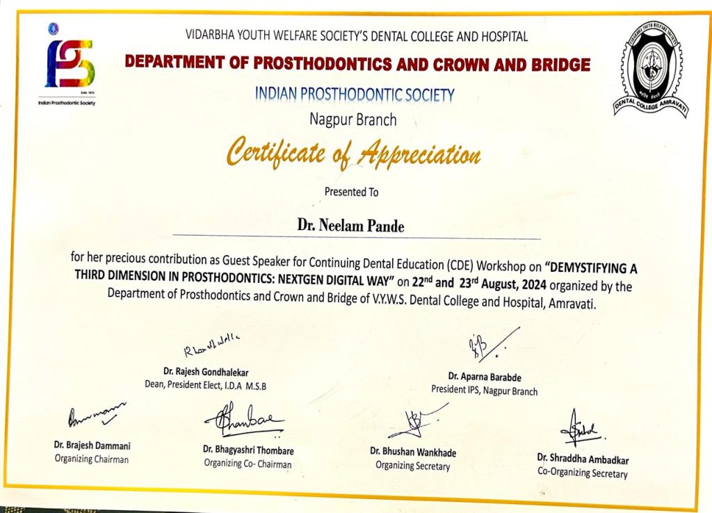 Dr. Neelam Pande, HOD, Prof., Ph.D. & P.G. Guide, Dept. of Prosthodontics, Ranjeet Deshmukh Dental College & Research Centre, Nagpur invited as Guest Speaker for CDE Workshop on “Demystifying a Third Dimension in Prosthodontics: Nextgen Digital Way” organized by Department of Prosthodontics and Crown and Bridge, V.Y.W.S. Dental College and Hospital, Amravati on 22nd and 23rd August 2024.