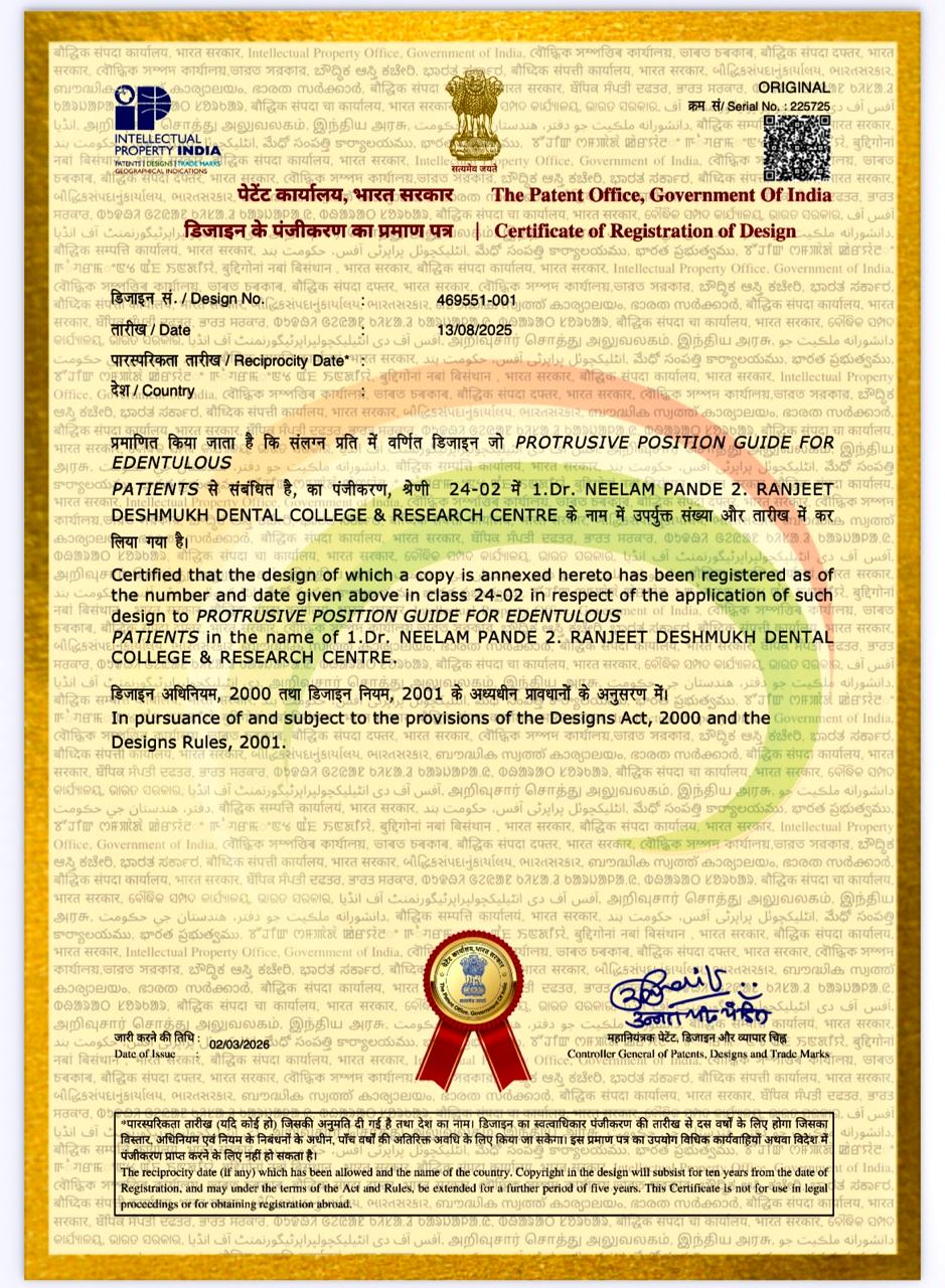 Dr. Neelam Pande, HOD, Prof., Ph.D. & P.G. Guide, Department of Prosthodontics, Ranjeet Deshmukh Dental College and Research Centre, Nagpur, Device Design titled: ‘Protrusive Position Guide for Edentulous Patients’ has been Registered in Patent Office, Government of India (Design No. 469551-001) on 2nd March 2026.