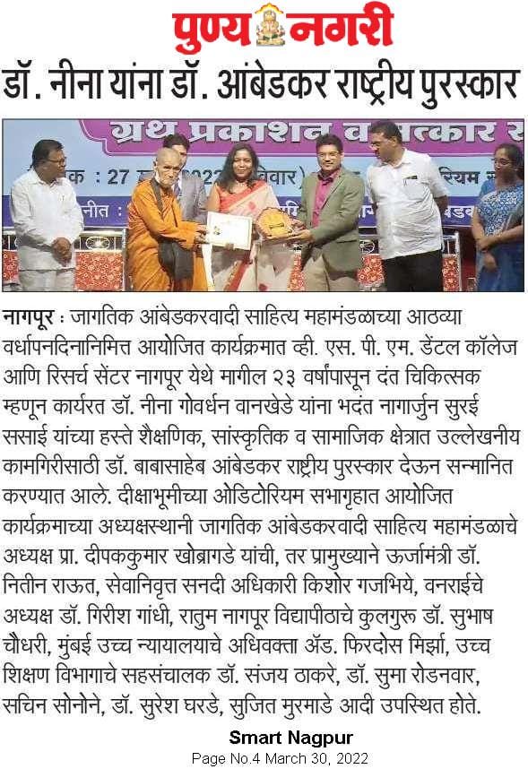 Dr. Neena Dongre Wankhede, Lecturer, Department of Oral and Maxillofacial Pathology, VSPM’s Dental College & Research Centre, Nagpur received “Dr. Babasaheb Ambedkar National Award” for her notable work as an ‘Artist’ by the hands of Hon’ble Bhadant Nagarjun Surai Sasai, organised on the occasion of 8th Foundation Day of ‘World Ambedkarite Art & Literature Forum’ at Ambedkar Auditorium, Dikshabhumi Nagpur