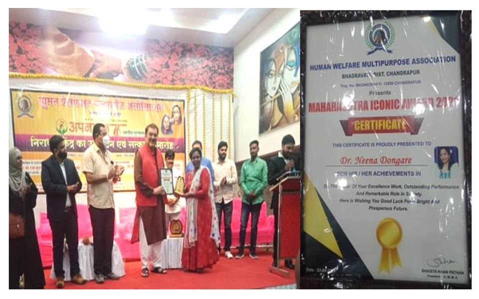 Dr. Neena Dongre Wankhede, Lecturer, Department of Oral and Maxillofacial Pathology, VSPM’s Dental College & Research Centre, Nagpur has received “Maharashtra Iconic Award 2021” as a ‘Social Activist’ by the hands of Legendary Bollywood Actor Raza Murad Sahab organized by Human Welfare Multipurpose Association at Bhadravati, Chandrapur