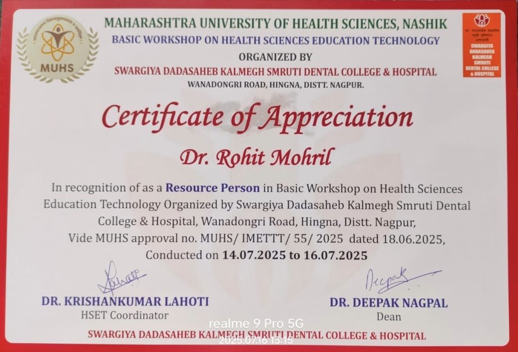 Dr. Rohit Moharil, Resource Faculty at HSET Basic Teachers Training Workshop on 14th – 16th July 2025 at Swargiya Dadasaheb Kalmegh Smruti Dental college & Hospital, Nagpur.