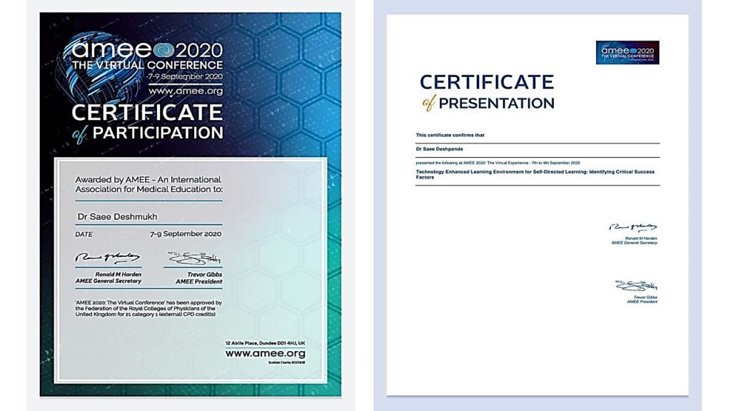 Dr. Saee Deshpande Asso. Prof and PG guide, Fellow FAIMER, Department of Prosthodontics, VSPM Dental College & Research Centre, Nagpur Presented Poster on “Technology Enhanced Learning Environment for Self Directed Learning: Identifying Critical Success Factors", in “AMEE 2020”-THE VIRTUAL CONFERENCE organized by An International Association for Medical Education