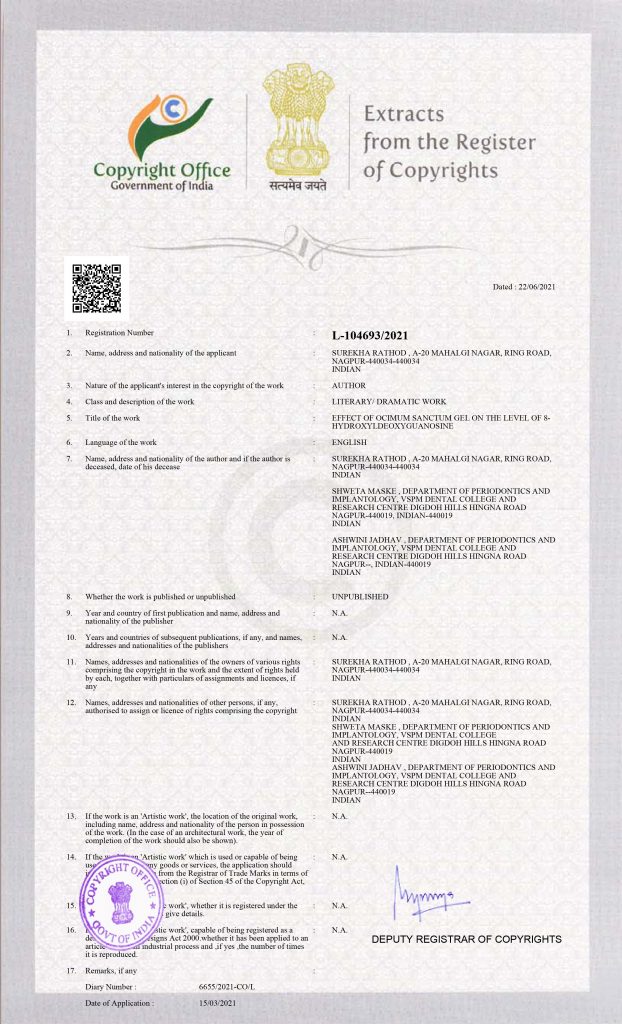 Dr. Surekha Rathod, Professor, Ph.D. Guide & P.G. Guide, Department of Periodontics and Implant Dentistry, VSPM Dental College & Research Centre, Nagpur has received a Copyright from Copyright Office, Government of India for her Literary work titled: “EFFECT OF OCIMUM SANCTUM GEL ON THE LEVEL OF 8- HYDROXYLDEOXYGUANOSINE”,