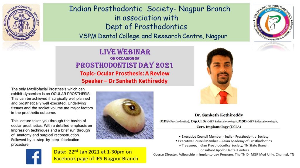 Indian Prosthodontics Society-Nagpur Branch in association with Department of Prosthodontics, VSPM Dental College and Research Centre, Nagpur is organizing a Live Webinar on the occasion of Prosthodontist Day by Dr. Sanketh Kethireddy on  “Ocular Prosthesis: A Review” – 22nd January 2021 at 1:30 p.m. & will be streamed live on the Facebook  page of IPS Nagpur Branch.