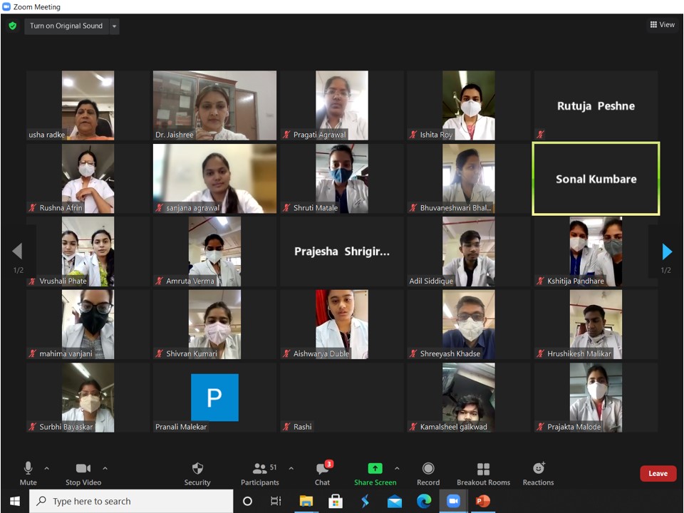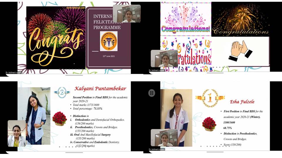 The Virtual Intern’s Felicitation programme was organized by Interns Monitoring Committee for interns of Summer & Winter 2020-21 batch on 15th June 2021. The Felicitation program was begun with inauguration and Dr. Usha Radke, Dean, VSPM’s DCRC, Nagpur & Dr. Ramakrishna Shenoi, Vice Dean VSPM DCRC, Nagpur, first of all congratulated all interns for their success in Final Year University Examination.