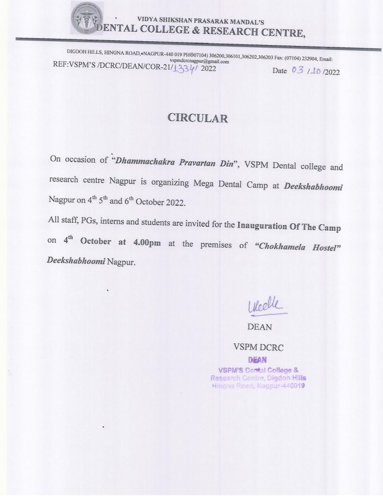 On the occasion of “Dhammachakra Pravartan Din”. VSPM’s Dental College & Research Centre, Nagpur organizing Mega Dental Camp at Deekshabhoomi, Nagpur from 4th – 6th October 2022.
