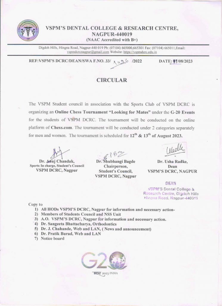 Student Council in association with Sports Club, Ranjeet Deshmukh Dental College and Research Centre, Nagpur organizing Online Chess Tournament “Looking for Mates” under G-20 Events for the students under men and women category on online platform-Chess.com on 12th and 13th August 2023.