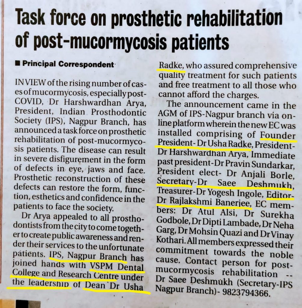 Indian Prosthodontics Society (IPS), Nagpur Branch in association with VSPM Dental College and Research Centre Nagpur, has announced a Task force on prosthetic rehabilitation of post-mucormycosis patients.