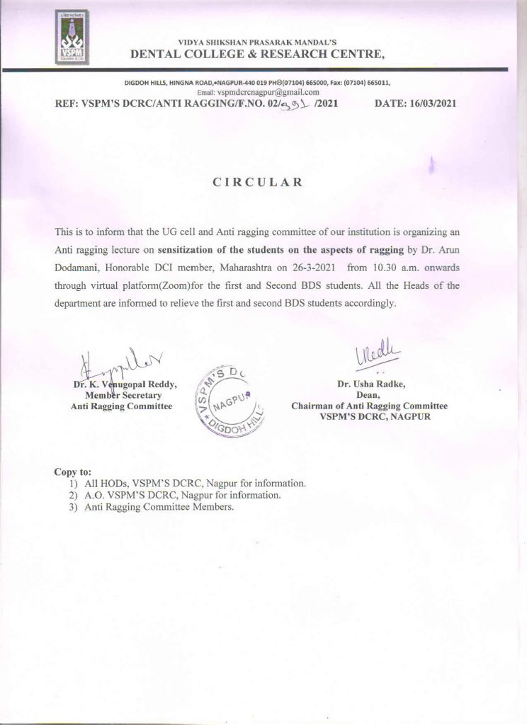 The UG Cell & Anti-ragging Committee , VSPM Dental College & Research Centre, Nagpur is organizing Online Anti ragging lecture for the First & Second BDS Students on “Sensitization of the students on the aspect of ragging” by Dr. Arun Dodamani, Hon’ble DCI Member, Maharashtra .Lecture will be conducted via zoom link & will be streamed live on YouTube Channel.