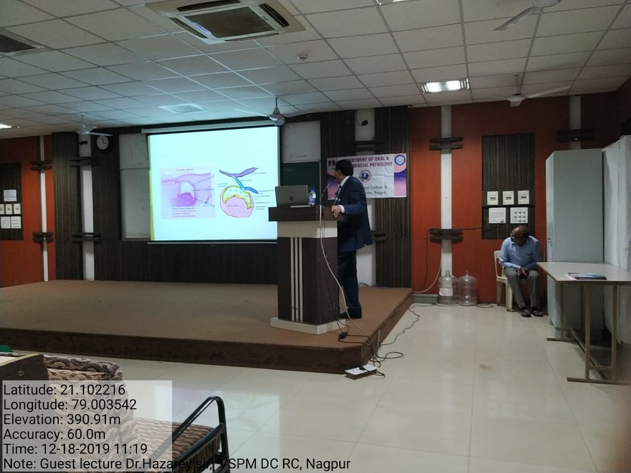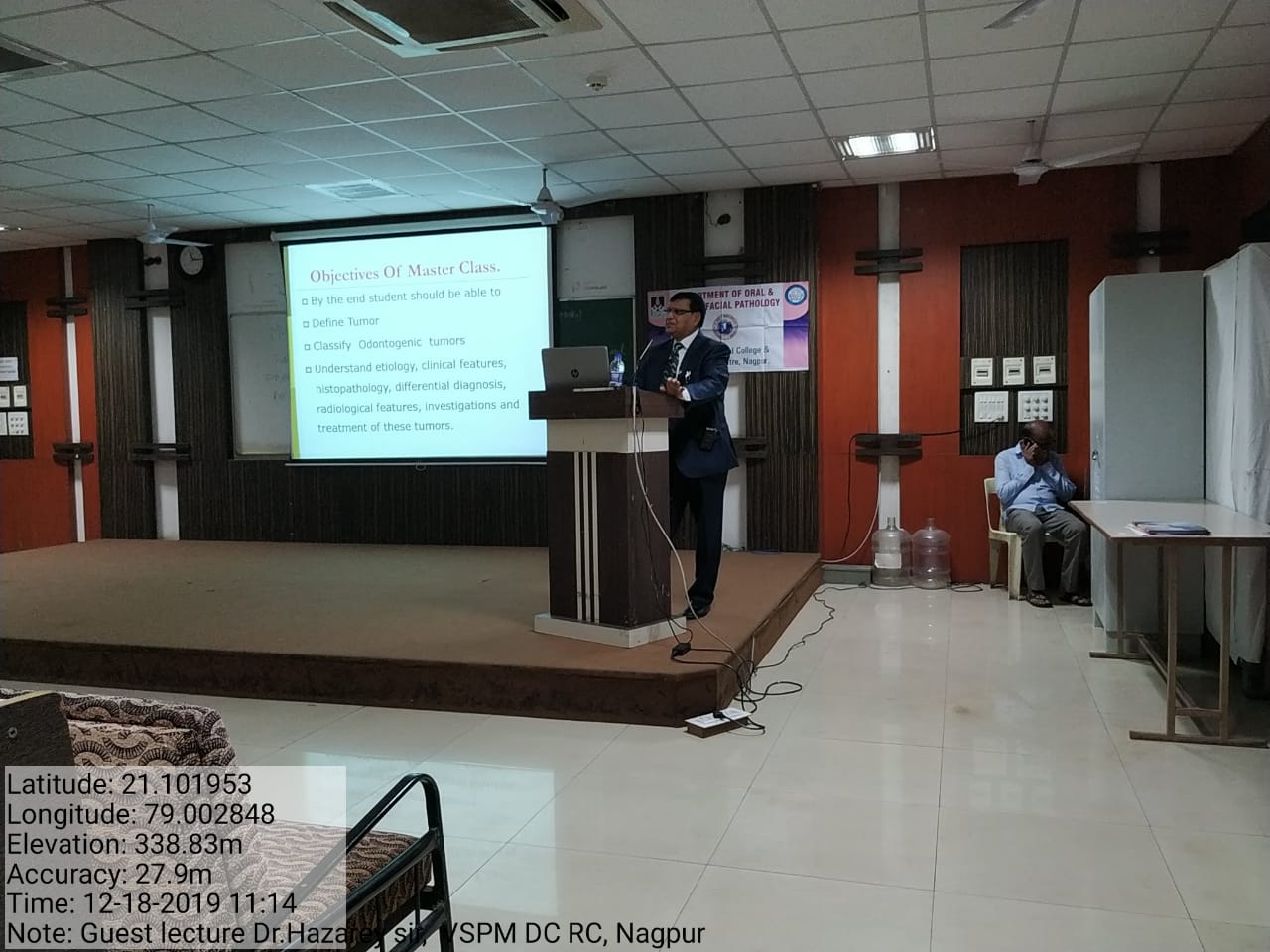Lecture was conducted on ODONTOGENIC TUMOURS by DR. V.K. HAZAREY, speaker who is most eminent personality in the field of Oral & maxillofacial Pathology. Objective of event was to explore odontogenic tumours in more detail. The session was interactive where speaker shared his knowledge on odontogenic tumours specially for IIIrd BDS students & interns.
