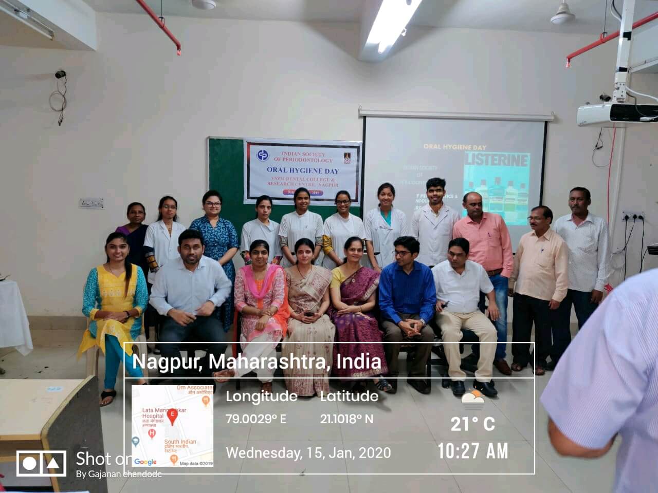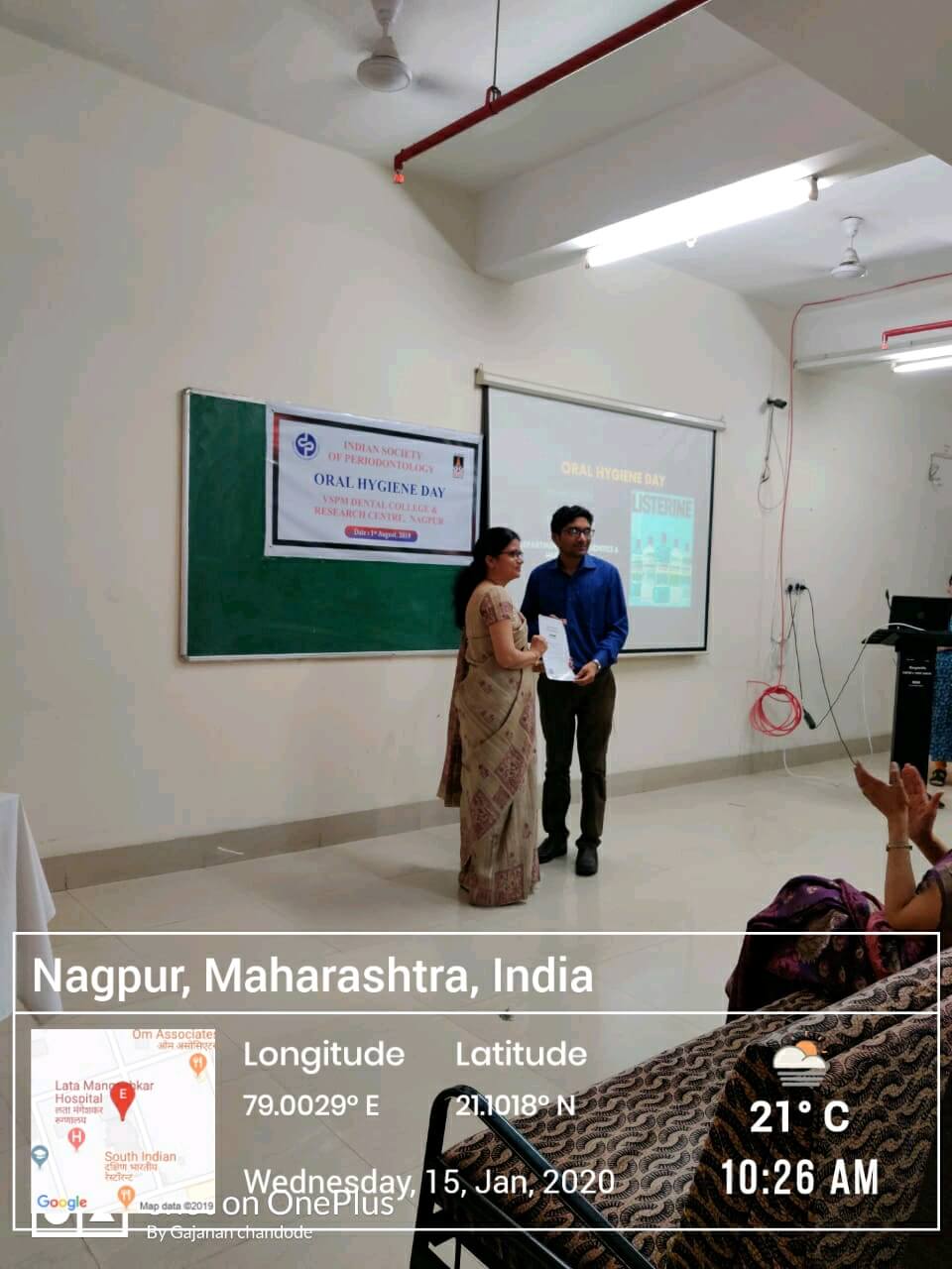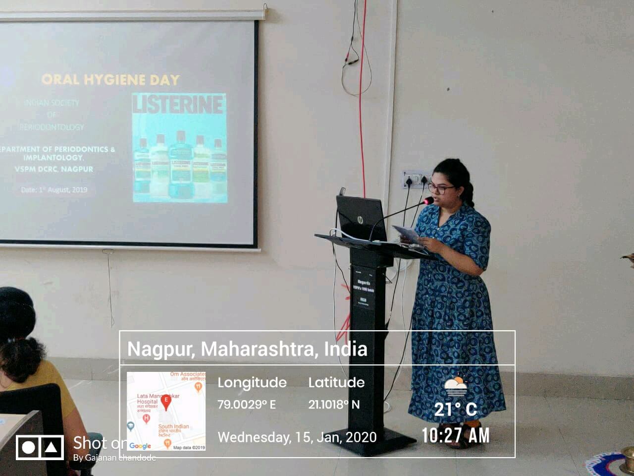 Oral Hygiene Day is observed every year to commemorate the birth anniversary of one of the legends of dental fraternity, the founder of Indian Society of Periodontology, Dr. G.B Shankwalkar. The motive behind this is the spread of awareness and knowledge regarding the importance of maintenance of oral hygiene and its systemic influences. With the similar convention it was organized at VSPM Dental College and Research Centre, Nagpur on 1stof August 2019 by Department of Periodontics and Implantology in association with Indian Society of Periodontology. Sponsored by Listerine lecture series this program was witnessed by a huge number of audience. Around 238 undergraduate students and the departmental staff attended the program. The master of ceremony for the program was Dr. Resham Pakhmode, Post graduate student, Department of Periodontics and Implantology, VSPM DCRC.