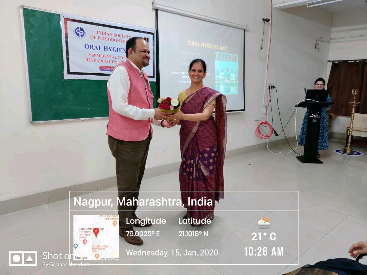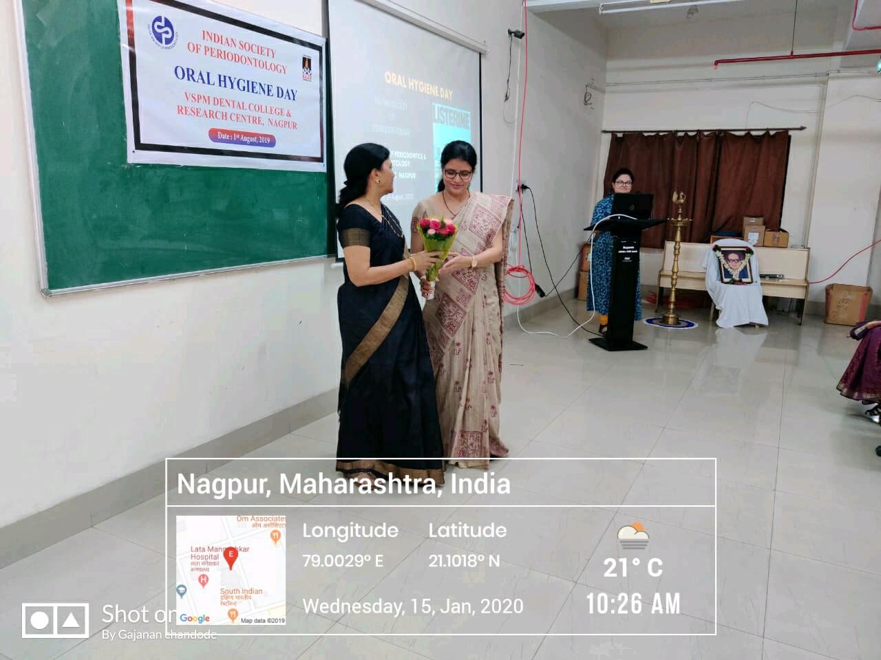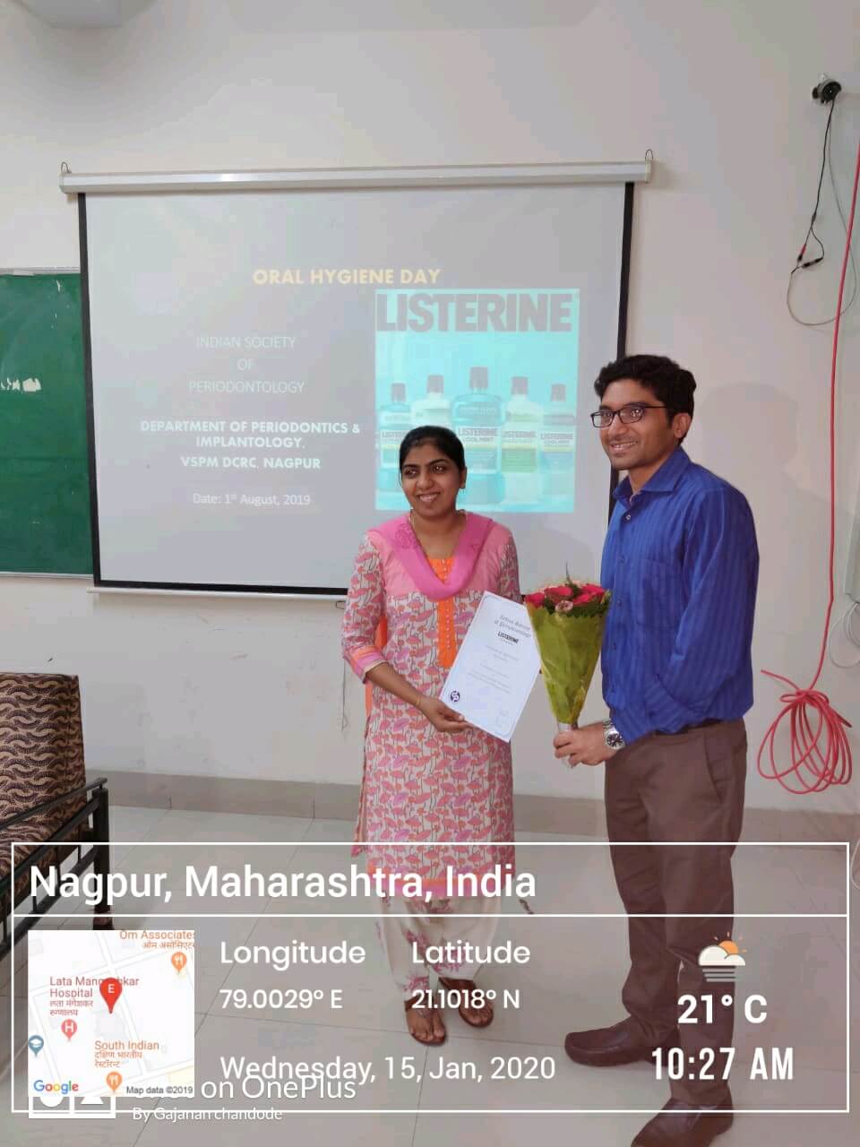 Oral Hygiene Day is observed every year to commemorate the birth anniversary of one of the legends of dental fraternity, the founder of Indian Society of Periodontology, Dr. G.B Shankwalkar. The motive behind this is the spread of awareness and knowledge regarding the importance of maintenance of oral hygiene and its systemic influences. With the similar convention it was organized at VSPM Dental College and Research Centre, Nagpur on 1stof August 2019 by Department of Periodontics and Implantology in association with Indian Society of Periodontology. Sponsored by Listerine lecture series this program was witnessed by a huge number of audience. Around 238 undergraduate students and the departmental staff attended the program. The master of ceremony for the program was Dr. Resham Pakhmode, Post graduate student, Department of Periodontics and Implantology, VSPM DCRC.