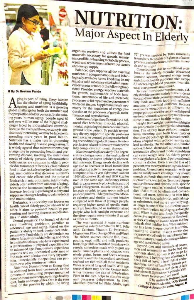 Dr. Neelam Pande’s article on “Nutrition for Elderly” was also published in daily newspaper Cake cutting was done by patients reported to the Department. The movie on Prosthodontic Rehabilitation was also displayed in the registration lobby of the college. The event was very much successful.