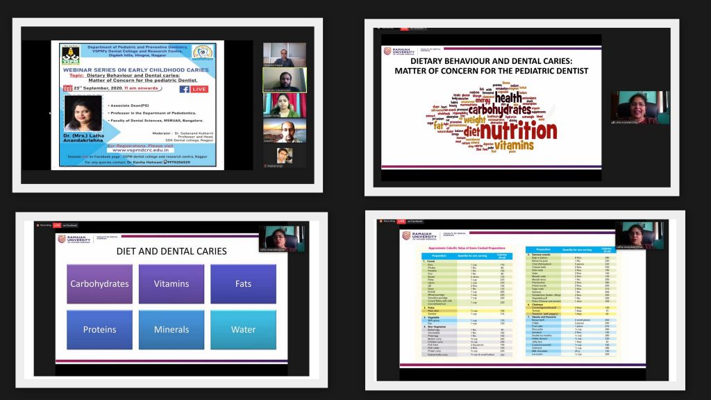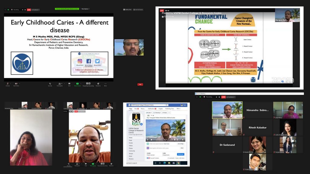 The Department of Pediatric and Preventive Dentistry, VSPM DCRC, Nagpur conducted a webinar series on Early Childhood Caries (ECC) from 22nd Sept to 24th Sept 2020. The webinar consisted of three sessions by eminent speakers of pediatric dentistry. The inaugural was graced by the Dean Dr Usha Radke and the Vice Dean Dr S. R. Shenoi who appreciated the initiative taken by the department. Dr Devendra Nagpal, Head of the Department gave the inaugural address.